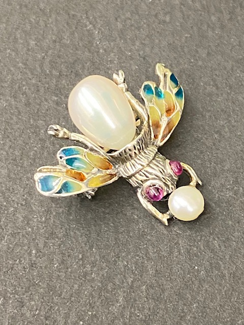 銀にエナメル プリカジュールの羽、眼は天然ルビーで胴体は真珠という 贅沢な蜂のブローチです。