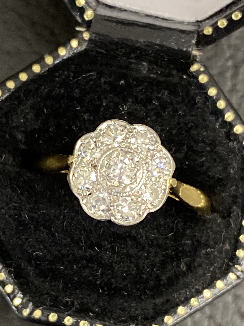 美しく輝くダイヤは ミル打ちされたプラチナのラインで囲まれ、センターのダイヤは良く見ると